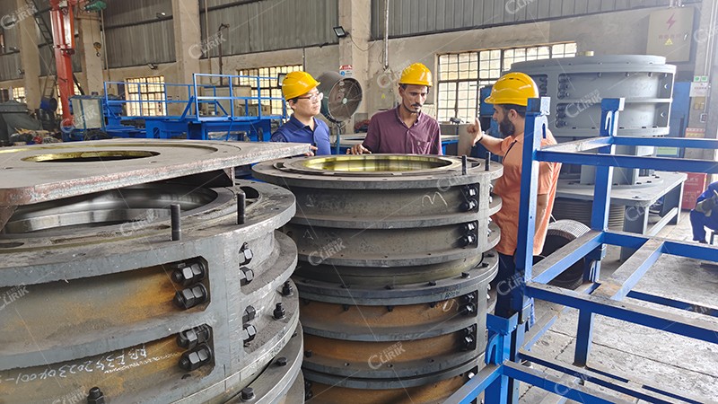展廳參觀之后,朱經理又帶領客戶來到我們的磨粉機生產車間,以磨輥和磨環為例,向客戶詳細介紹了超細磨粉機的易損件都有哪些,以及易損件的保養維護方法和使用技巧是什么。